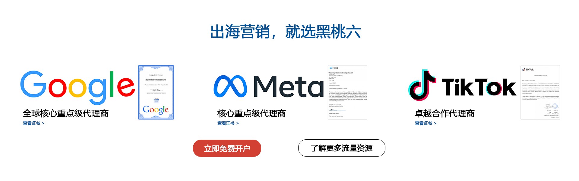 武汉市黑桃六科技有限公司是专业的出海营销服务商。作为FACEBOOK, TIKTOK和GOOGLE等海外官方渠道代理商,我们专注于提供海外推广策划,海外广告创意制作,海外广告投放指导,海外媒介投放,海外品牌策略咨询,海外本地化运营,新媒体大数据服务的一站式海外推广营销方案。